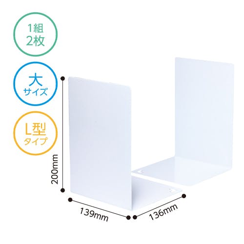 ●色…ホワイト●サイズ…136(W)×139(D)×200(H)mm●材質…スチール(カラー焼付け塗装)●重量…436.5g●入数…2枚●デスク上の本や資料整理に便利。●シンプルで飽きのこないデザイン。●裏面に滑り止めパッドが付いているので整理した書類などをしっかりキープ。