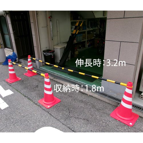 ●仕様…伸縮コーンバーのみ●長さ…1.85~3.25m(伸縮タイプ)●使用サイズ…1.75m~3.15m(伸縮タイプ)●色…黄/黒●重量…580g●材質…ABS●両端リング内径…φ80mm●ポール外径…φ41mm(伸縮部はφ35mm)●反射シート幅…150mm●入数…5本●約1.8m~3.2mまで伸縮する為、使用場所によって長さを調整できます。●(例)3mバリケード時:ガードバー1本とカラーコーン2本でバリケード可能●最大伸長時は中心部が若干たわみます。