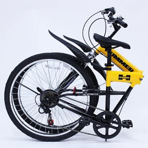 ●メーカー…ミムゴ●型番…MG-HM266E●商品名…HUMMER(ハマー)●フレーム材質…スチール●組立サイズ…172×55.5×105.5cm●折りたたみサイズ…100×57×96cm●サドル高さ…約810~930mm●推奨適応体重…65kg●タイヤサイズ…26型●ギア数…6段変速●重量(kg)…約17●カラー…イエロー●材質…スチール (リム:アルミ合金)●フレームの折畳み部分を2重に固定●ハンドルを差し込んで固定します。●JISフレーム強度試験合格品