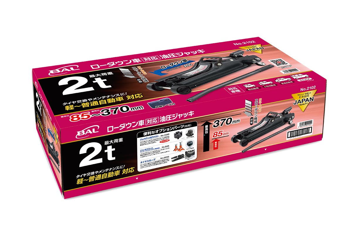●メーカー…大橋産業(BAL)●型番…2102●能力…2t●揚幅…85~370mm●幅…180mm●ハンドル長…500mm●重量…15kg●サイズ(W×D×H)mm…645×285×180mm●材質…スチール●作動油…ISO VG10●作動油量…105ml●軽自動車~普通乗用車のタイヤ交換やメンテナンスに!●ローダウン車対応!●ジャッキダウンの際にゆっくり下がる、安心・安全のスローダウン機構搭載●別売のジャッキ用アダプターを使用する事でサイド揚げにも対応します。●収納ケース付き!!