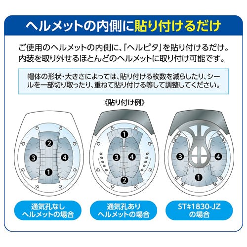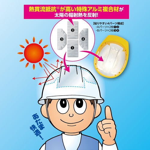 ●用途…ヘルメット用●入数…4枚1組●材質…特殊アルミ複合材●サイズ…Aパーツ:102(W)×165(H)mmBパーツ:87(W)×200(H)mm●重量…20g●ヘルメットの内側に貼るだけで、ヘルメット内の温度上昇を抑制します。●特殊アルミ複合材が太陽の輻射熱を反射します。●内装を取り外せるほとんどのヘルメットに取付可能●使い捨てタイプ