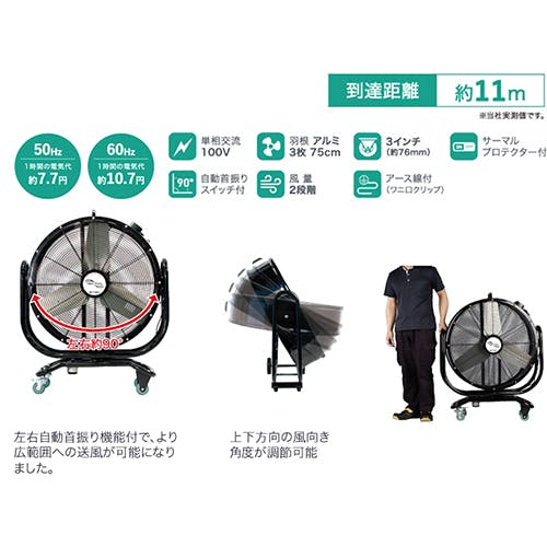 ●メーカー…ナカトミ●型番…BF-75ZS●ファン径…750mm●コード…2.4m●電源…AC100V(50/60Hz)●消費電力(50/60Hz)…248/344W●最大風量(50/60Hz)…405/437m3/分●最大風速(50/60Hz)…183/214m/分●サイズ…890×310×1110(H)mm●重量…38kg●騒音値…78/82dB●首振り角度調節…左右90°(自動)●キャスター径…約76mm●全閉型モーター