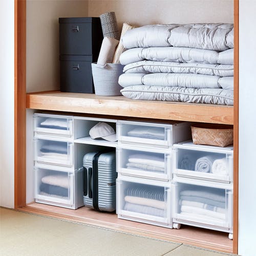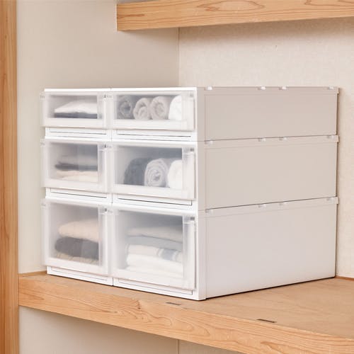 ●材質…天板・外枠・引出し:ポリプロピレン前パネル・前倒れ防止用ジョイント具:スチロール樹脂ゴム脚:エラストマー補強板:アルミ●付属品…ゴム脚、前倒れ防止用ジョイント具●積み重ね可能●天板のたわみを防ぐアルミ補強板を内蔵。積み重ねた下段も変形しにくい高品質な頑丈設計です。●フローリングや畳の床面にやさしいゴム脚付き。●積み重ねて引出しを引いたときの前倒れを防ぐ、前倒れジョイント具付き。●押入れに最適なロングタイプ●便利なインデックスシール付き。