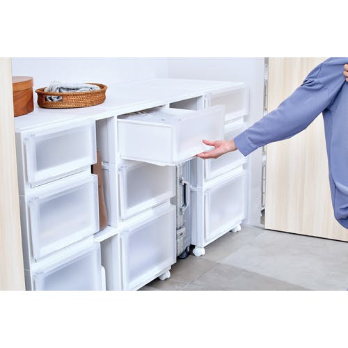 ●材質…天板・外枠・引出し:ポリプロピレン前パネル・前倒れ防止用ジョイント具:スチロール樹脂ゴム脚:エラストマー補強板:アルミ●付属品…ゴム脚、前倒れ防止用ジョイント具●積み重ね可能●天板のたわみを防ぐアルミ補強板を内蔵。積み重ねた下段も変形しにくい高品質な頑丈設計です。●フローリングや畳の床面にやさしいゴム脚付き。●積み重ねて引出しを引いたときの前倒れを防ぐ、前倒れジョイント具付き。●クローゼットやリビングに最適です。●上からも下からも引き出せます。