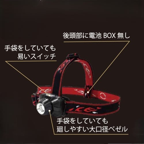 ●使用電池…単4×3本(別売)●明るさ…強:500ルーメン中:260ルーメン弱:30ルーメン●光源…高輝度チップ型LED球1灯●サイズ…67×48×55(H)mm●重量…55g(本体のみ)90g(電池含)●防水性能…IPX4●ベルト幅…25mm●照射パターン…フォーカス(スポット⇔ワイド)●電池寿命…強:5時間中:6.5時間弱:35時間●照射特性…ワイド1m先で1.5mスポット1m先で37mm●照射距離…100m●耐衝撃性…1m●充電式ニッケル水素電池対応