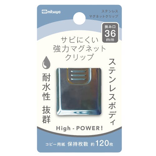 ●口幅(mm)…36●綴り枚数(A4)…120枚●材質…本体:ステンレス裏面:異方性強力磁石●サイズ…42×36×28mm●重量…46g●ステンレスボディ―でサビにくいマグネットクリップ。●磁石の厚みも強化し磁力も抜群です。●耐水性抜群