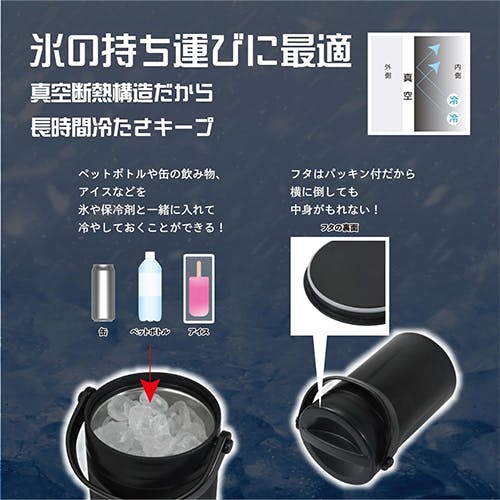 ●真空二重構造だから氷の持ち運びに最適。長時間冷たさキープ。●口が広いので大きな氷もそのまま入ります。●氷嚢用の氷の持ち運びにも