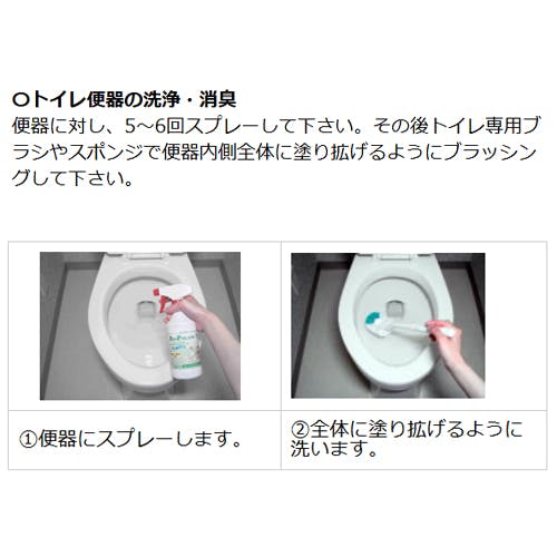 ●【使い方】最初は原液を使用しますが、効果が出てくれば水で希釈して使用する事も可能・トイレ便器:便器内に5~6回スプレーし、ブラシやスポンジで洗浄してください。(希釈:~3倍)・床面(乾式):原液または希釈液をスプレーし、モップ等で拭き上げます。(希釈:~10倍)・床面(湿式):原液または希釈液をスプレーし、ブラシ等で洗浄し、水洗いします。(希釈:~10倍)