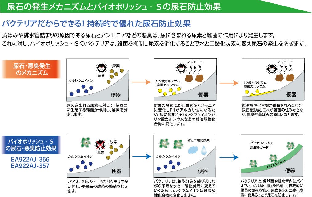 ●人と環境にやさしい天然の善玉バクテリアを主成分、汚れを生分解し水と二酸化炭素に変換●すぐれた洗浄・消臭効果中性の洗浄成分とバクテリアのW効果で、汚れや悪臭を元から分解●除菌・防臭・尿石防止効果尿石や悪臭の原因である汚れの蓄積や雑菌を抑制●清掃作業の軽減バイオフィルムが汚れをガード、清掃作業時間が短縮●中性タイプで安心塩素も酸も使用しない中性タイプで、腐食や有毒ガスの発生がない●希釈可能で経済的効果が安定すれば、水で希釈して使用可能