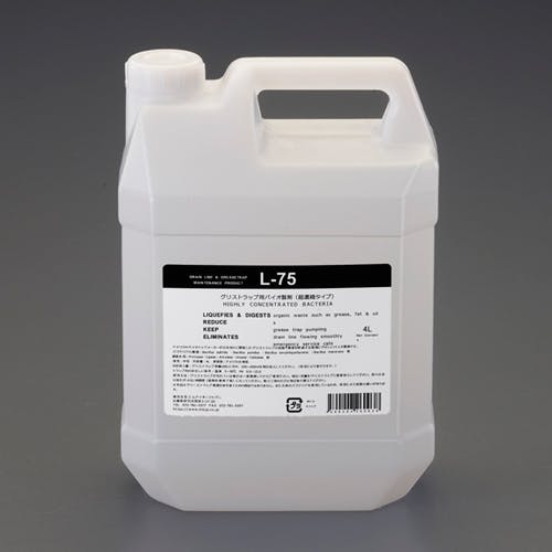 ●メーカー…エムアイオージャパン●型番…L-75●用途…グリストラップの消臭、油脂分解●内容量…4L●容器サイズ…120(W)×190(D)×275(H)mm●重量…4.3kg●成分…バクテリア、界面活性剤●液性…中性●液色…白濁色●使用目安量…100~200ml/日●グリーストラップの特有の悪臭の発生を防止し、油脂の蓄積を軽減する液体のバクテリア製剤です。