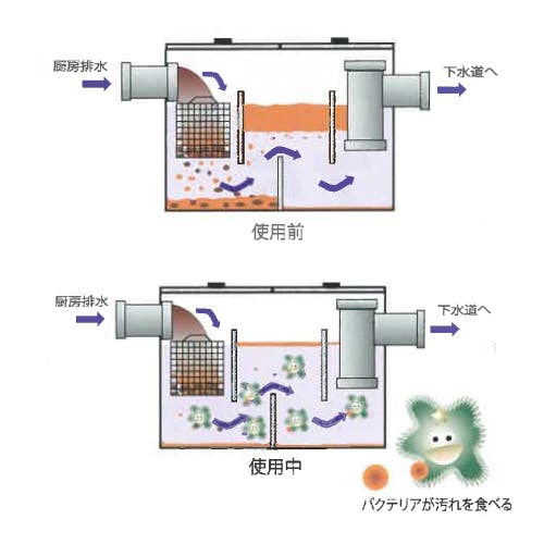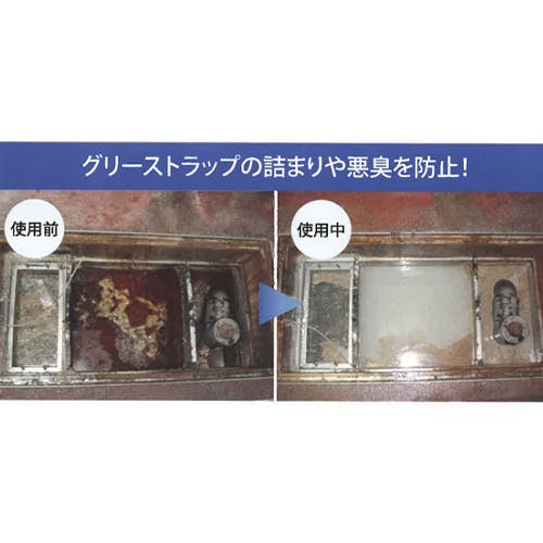 ●本品使用後、約1週間程度で悪臭が消え、3~4週間後に油脂の軽減が見られます。●【使い方】1.ご使用前に必ずグリストラップの洗浄をします。2.厨房作業が終わった後、毎日一定量をグリーストラップに直接投入するか、グリーストラップに一番近いシンクの排水口や床側溝から投入します。