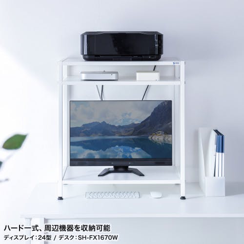 ●モニターの上に棚を増設できる、机上ラックです。縦の空間を上手く利用して、小物や機器をすっきり収納できます。●H700mmのデスクにぴったりあわせて、サイドラックとしても使えます。●中棚は4段階で調節可能●アジャスター付きで高さを調整し、ガタつきを解消します。
