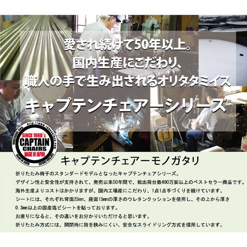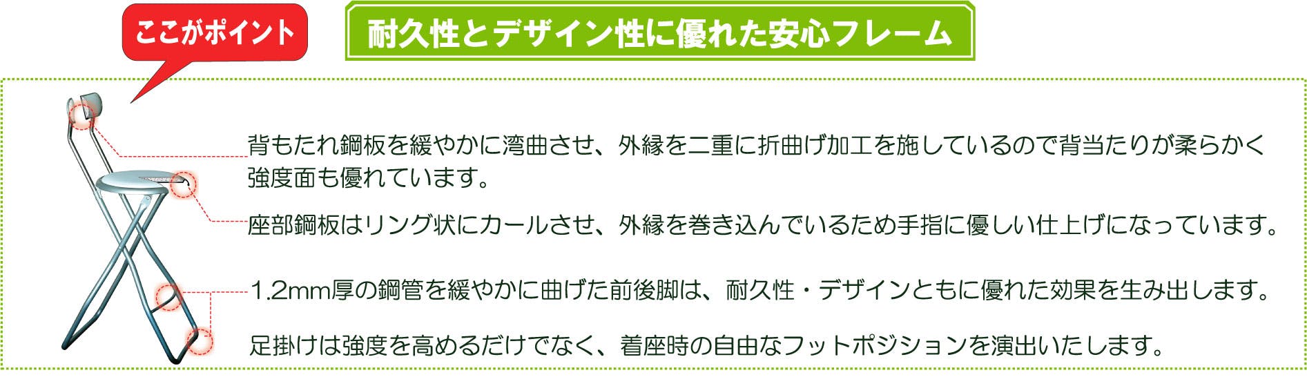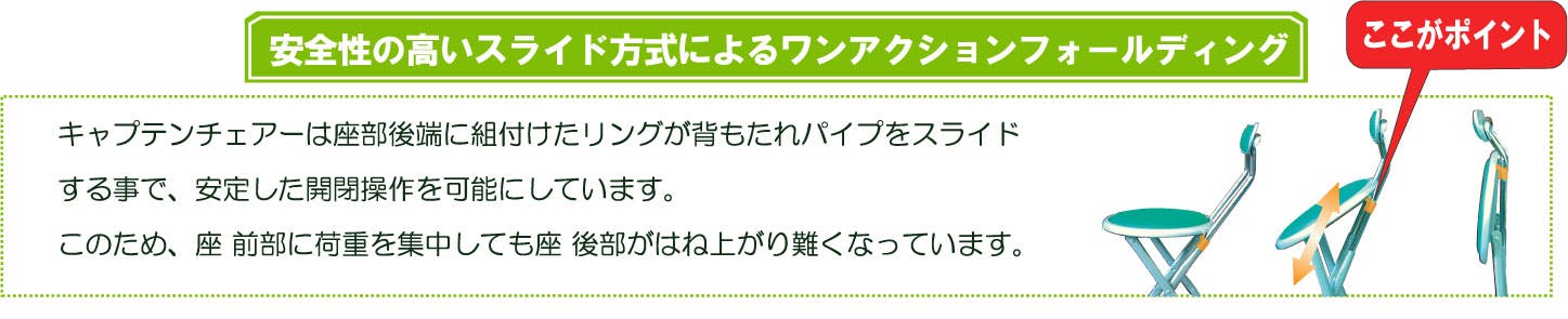 ●安全性の高いスライド方式によるワンアクションフォールディング●耐久性とデザイン性に優れた安心フレーム●背もたれ銅板を緩やかに湾曲させ、外縁を二重に折り曲げ加工を施しているので背当たりが柔らかく強度面も優れています。●座部銅板はリング状にカールさせ、外縁を巻き込んでいるため手指に優しい仕上げになっています。●1.2mm厚の銅管を緩やかに曲げた前後脚は、耐久性・デザインともに優れた効果を生み出します。