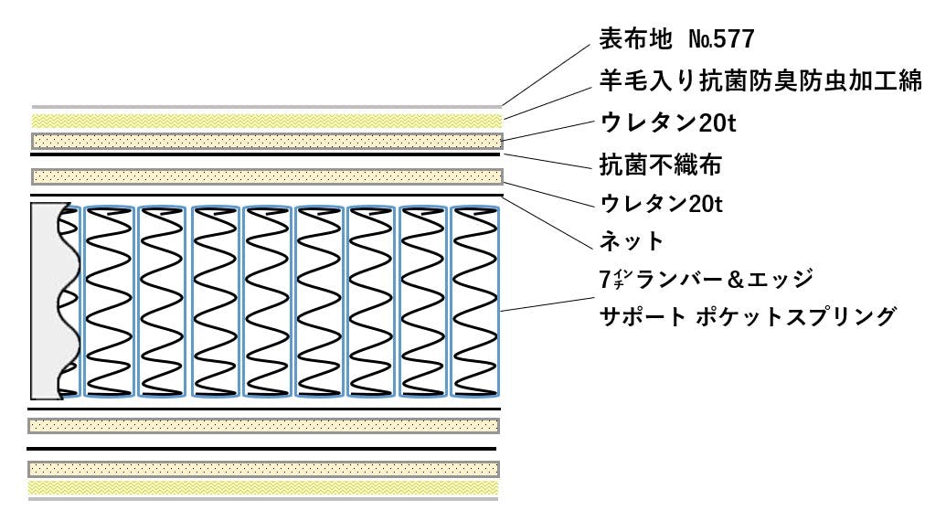 従来モデルよりも約80%増のスプリングを内蔵。腰に優しい、腰部補強・エッジ部補強モデル。保温性、通気性が抜群の羊毛綿入りです。仰向け寝などにおすすめのミディアムハード仕上げの硬さです。