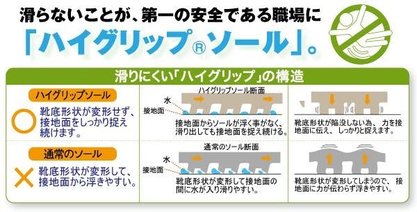 ●耐滑性能の最高区分5(安全靴・作業靴技術指針)●転倒事故を防止するハイグリップソール