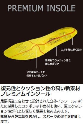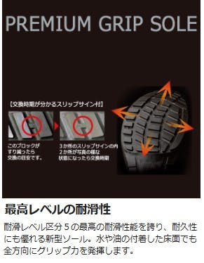 ●JIS T8103 (ED-P/C2)/CI/S/P1/F2●足幅サイズ:EEE●靴底のかかと中央部に一段低く配置されたブロックが接地時に衝撃を分散させます。●かかと部分に縦2本の反射材を配置しました。●耐滑レベル区分5の最高の耐滑性能を誇り、耐久性にも優れる新型ソール。水や油の付着した床面でも全方向にグリップ力を発揮します。