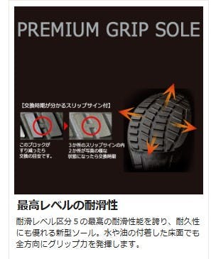 ●JIS T8103 (ED-P/C2)/CI/S/P1/F2●足幅サイズ:EEE●クッションアブソーバー:カカト中央の一段低く配置されたブロックが接地時に衝撃を分散させます。●耐滑レベル区分5の最高の耐滑性能を誇り、耐久性にも優れる新型ソール。水や油の付着した床面でも全方向にグリップ力を発揮します。
