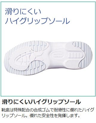●足幅サイズ:EEE●靴底は特殊配合の合成ゴムで耐滑性に優れたハイグリップソール。優れた安全性を発揮します。●発泡EVAと合成ゴムの2層底。軽量でクッション性に優れています。●食品生産・加工・厨房などでの安全管理や衛生管理に抗菌性能が新たに加わりました。●油や水など滑りやすい床面での作業に適した滑りにくい靴です。●クッション性に優れた素材を使用し足にかかる衝撃を軽減します。