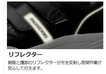 ●JSAA認定 A種人工皮革製プロスニーカー/踵衝撃吸収 ●「先芯および先芯内蔵靴」 特許取得●足幅サイズ:EEE●台車の車輪が衝突しても小指部に乗り上げない特許取得の小指保護先芯。●軽量でクッション性に優れたEVAのミッドソールと、耐久性に優れた合成ゴム製のアウトソールを採用。●夜間での作業でも光を反射させ自分の位置を知らせることが可能なリフレクター付き。