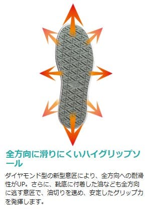 ●JSAA認定 A種人工皮革製プロスニーカー/踵衝撃吸収/耐滑●足幅サイズ:EEE●塗り床・グレーチング床・ステンレス床・タイル床・細かい凸凹床などが混在する環境でも高い耐滑性能を発揮します。●樹脂先芯: 樹脂製の軽い先芯を使用。JSAA認定A種合格の性能です。●靴底の減りによる交換時期が分かるスリップサイン付き