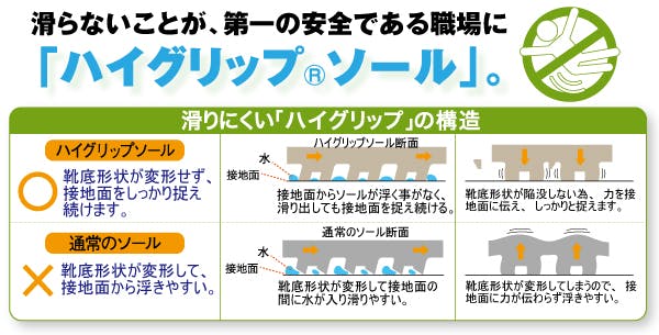 ●足幅サイズ:EEE●滑りにくい秘密は、特殊な配合を施した材料とスリップを起こしにくい靴底意匠とそれを支える補強構造のトリプル効果で、安全靴・作業靴技術指針で定められた耐滑性能の最高区分5を実現しています。さらに、詰まりにくい意匠を採用、靴底詰まりによる耐滑性の低下防ぎます。●熱・薬品・水・油に強く、水や油等の付着した床面でも滑りにくいハイグリップソール。