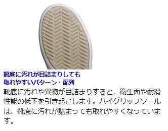 ●足幅サイズ:EEE●特殊な配合を施した材料とスリップを起こしにくい靴底意匠と、それを支える補強構造のトリプル効果が地面をしっかり捉えます。●クッション部を短く厚く設計。クッション部で足首にしっかりフィット、通気エリアから靴内のムレを逃します。●靴底に汚れや異物が目詰まりすると、衛生面や耐滑性能の低下を引き起こします。ハイグリップソールは、靴底に汚れが詰まっても取れやすくなっています。