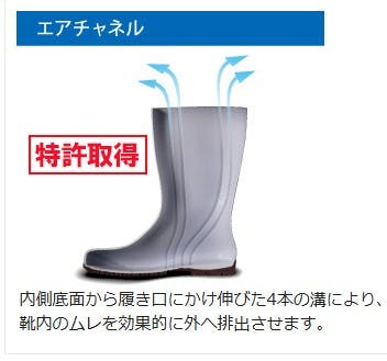 ●足幅サイズ:EEE●内側底面から履き口にかけ伸びた4本の溝により、靴内のムレを効果的に外へ排出させます。●筒が細い、または太い場合には、お手持ちの紐等を使用し調整可能な穴あけ溝付。●エアチャネルの効果を損なわず、ムレを緩和させる通気孔付きのインソールを採用。適度な厚みもあり、足へかかる負担も軽減します。水・油・薬品が靴内に浸透するのを防ぐ仕様の靴です。