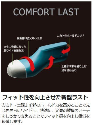 ●JIS T8101 CI/S/P1/F2●クッションアブソーバー:カカト中央の一段低く配置されたブロックが接地時に衝撃を分散させます。●エグリ形状になったソールが歩行時に形状が変形することで衝撃を吸収しクッション性を向上。●旧コンフォートと比べ、よりつま先を高めに設計。それにより段差での引っ掛かりを軽減し、つまずきによる転倒事故防止に役立ちます。