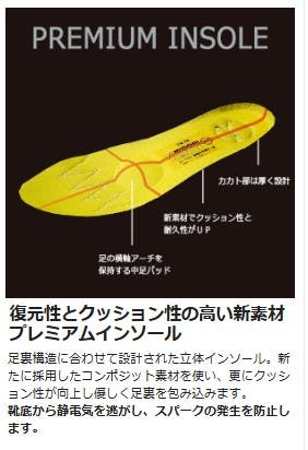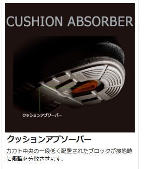 ●JIS T8103 (ED-P/C2)/CI/S/P1/F2●靴底から静電気を逃がし、スパークの発生を防止します。●クッションアブソーバー:カカト中央の一段低く配置されたブロックが接地時に衝撃を分散させます。●エグリ形状になったソールが歩行時に形状が変形することで衝撃を吸収しクッション性を向上。