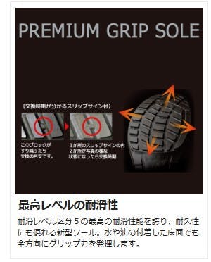 ●JIS T8103 (ED-P/C2)/CI/S/P1/F2●靴底から静電気を逃がし、スパークの発生を防止します。●クッションアブソーバー:カカト中央の一段低く配置されたブロックが接地時に衝撃を分散させます。●エグリ形状になったソールが歩行時に形状が変形することで衝撃を吸収しクッション性を向上。