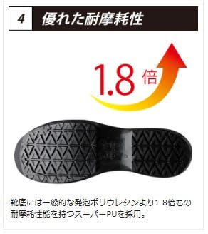 ●JIS T8101 CI/S/P1/F2。●靴底の減りによる交換時期が分かるスリップサインを設置。3箇所のうち2箇所が磨り減ったら交換時期です。●靴底には一般的な発泡ポリウレタンより1.8倍もの耐摩耗性能を持つスーパーPUを採用。●足裏形状に合わせた立体的に成型した新コンフォート設計の靴底。