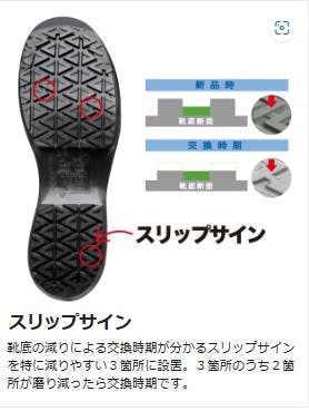 ●JIS T8103(ED-P/C2)/CI/S/P1/F2●歩行時に起こる、つまずきを予防する為に、トウスプリングを上げ、凸部を設けないつまずき防止設計を採用しました。●靴底の減りによる交換時期が分かるスリップサインを特に減りやすい3箇所に設置。3箇所のうち2箇所が磨り減ったら交換時期です。