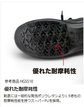 ●靴底には一般的な発泡ポリウレタンより1.5倍もの耐摩耗性能を持つスーパーPUを採用。●幅広で履きやすく、軽量な樹脂先芯を使用しています。●足裏形状に合わせた立体的に成型した靴底。●PEカップインソール:かかと部は通常の2倍の厚みの優れたクッション性と足に馴染むソフト感。足のアーチの落ち込みを防ぎ疲労を軽減。●足幅サイズ:EEE●標準高さ:240mm※●標準高さは、26.0cmを基準としています。●標準重量:1,070g/足※両足での重さです※●標準重量は、26.0cmを基準としています。