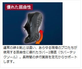 ●JIS T8108 CI/F1/E/H/BO●通常の紳士靴とは違い、あらゆる現場のプロたちが使用する屈曲性に優れたラバー2層底(ラバーテックソール)。長時間の歩行業務を足元からサポートします。●耐滑区分4(※)の性能をもった滑りにくい靴底です。雨の日や、濡れた床等での滑り事故を予防します。