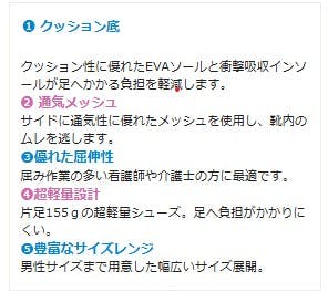 ●優れた屈伸性で屈み作業の多い看護師や介護士の方に最適です。●片足155gの超軽量シューズ。足へ負担がかかりにくい。●かかとに5mmの衝撃吸収クッションの付いたインソールを内装。●男性サイズまで用意した幅広いサイズ展開。