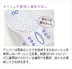 ●JIS T8103 一般静電作業靴に相当●一般的なメディカルシューズは、ムレを考慮し通気性の良いメッシュ素材を使用したり、靴底に通気穴を設けたものが多い為「感染防止対策」には着用できません。CSS-15Siは血液や体液、薬品に暴露する可能性がある業務向けに開発したオール人工皮革のアッパーを使用した感染防止対策シューズです。●人体に帯電した静電気を靴底から逃す静電気帯電防止性能が付いたシューズ。