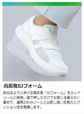 ●JIS T8103 一般静電作業靴に相当●跳ねるように歩ける高反発「SJフォーム」をミッドソールに採用。指で押しただけでも感じる柔らかい素材で、通常のEVAソールと比較し高い反発力とクッション性を発揮します。