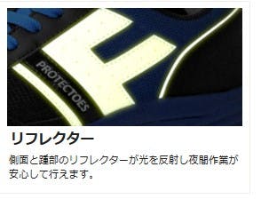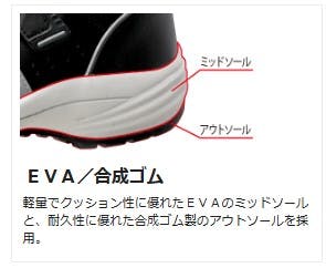 ●JSAA認定 A種人工皮革製プロスニーカー/踵衝撃吸収●「先芯および先芯内蔵靴」 特許取得台●車の車輪が衝突しても小指部に乗り上げない特許取得の小指保護先芯。●軽量でクッション性に優れたEVAのミッドソールと、耐久性に優れた合成ゴム製のアウトソールを採用。●側面と踵部のリフレクターが光を反射し夜間作業が安心して行えます。●スリップサイン搭載