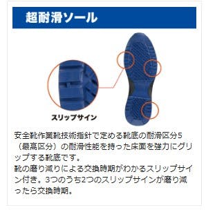 ●鋼製先芯と比べ、樹脂製の為、サビずに冷えにくく幅広なワイド樹脂先芯。JSAA認定A種の安全性能。●軽量でクッション性・耐久性にも優れ水・油や水などの滑りやすい床でも滑りにくいハイグリップソールです。●クッション性に優れた素材を使用し足にかかる衝撃を軽減します。●夜間での作業でも光を反射させ自分の位置を知らせることが可能なリフレクター付き。●足幅サイズ:EEE●標準重量:640g/足※両足での重さです※●標準重量は、26.0cmを基準としています。