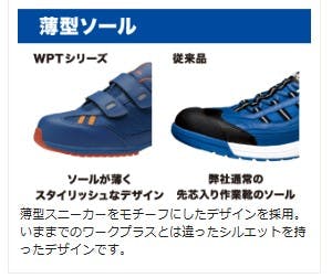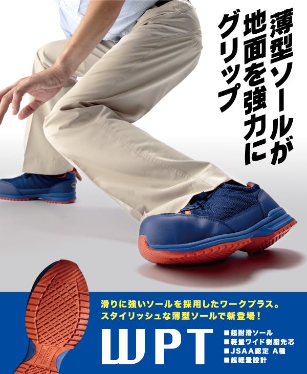 ●JSAA認定 A種人工皮革製プロスニーカー/踵衝撃吸収/耐滑●靴の磨り減りによる交換時期がわかるスリップサイン付き。3つのうち2つのスリップサインが磨り減ったら交換時期。●薄型スニーカーをモチーフにしたデザインを採用。いままでのワークプラスとは違ったシルエットを持ったデザインです。