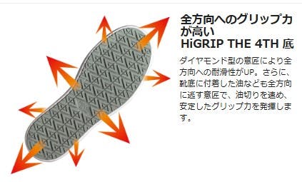 ●ダイヤモンド型の意匠により全方向への耐滑性がUP。さらに、靴底に付着した油なども全方向に逃す意匠で、油切りを速め、安定したグリップ力を発揮します。●縦方向はもちろん、斜め方向にも液体が通るため、接地面に水分が付着しにくい。●甲板、ソール等の素材、製法にこだわった軽量設計の靴です。●スリップサイン搭載