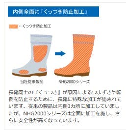 ●安全靴技術指針の定める耐滑性の最高レベル、区分5を実現した耐滑底。●エアチャネル:内側底面から履き口にかけ伸びた4本の溝により、靴内のムレを効果的に外へ排出させます。●長靴同士の『くっつき』が原因によるつまずきや転倒を防止するために、長靴に特殊な加工が施されています。従来の製品は内側3カ所に加工していましたが、NHG2000シリーズは全面に加工を施し、さらに安全性が高くなっています。