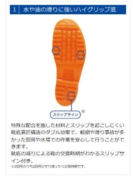 ●靴底の減りによる靴の交換時期がわかるスリップサイン付き。●長靴同士の『くっつき』が原因によるつまずきや転倒を防止するために、表面に特殊な加工を施しています。●内側底面から履き口にかけ伸びた4本のエアチャネルにより、靴内のムレを効果的に逃します。