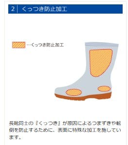 ●靴底の減りによる靴の交換時期がわかるスリップサイン付き。●長靴同士の『くっつき』が原因によるつまずきや転倒を防止するために、表面に特殊な加工を施しています。●内側底面から履き口にかけ伸びた4本のエアチャネルにより、靴内のムレを効果的に逃します。