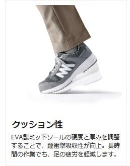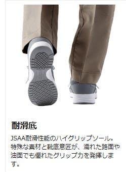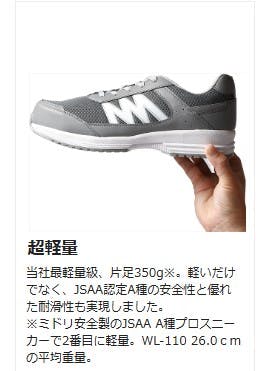 ●先芯:ワイド樹脂●甲被:人工皮革/メッシュ●中敷:EVA カップインソール(抗菌・防臭)●靴底:EVA/合成ゴム●標準重量:700g/足※両足での重さです※標準重量は、26.0cmを基準としています。●JSAA 認定 A種人工皮革製プロスニーカー/踵衝撃吸収/耐滑●優れた耐滑性能と衝撃吸収を持ちながら、驚くほど軽量化を実現したプロスニーカー。現場での負担を軽減し、快適な作業をサポートします。●原産国:中国