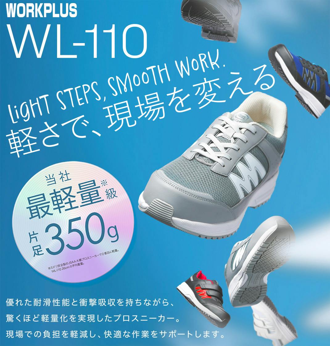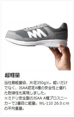 ●先芯:ワイド樹脂●甲被:人工皮革/メッシュ●中敷:EVA カップインソール(抗菌・防臭)●靴底:EVA/合成ゴム●標準重量:700g/足※両足での重さです※標準重量は、26.0cmを基準としています。●JSAA 認定 A種人工皮革製プロスニーカー/踵衝撃吸収/耐滑●優れた耐滑性能と衝撃吸収を持ちながら、驚くほど軽量化を実現したプロスニーカー。現場での負担を軽減し、快適な作業をサポートします。●原産国:中国