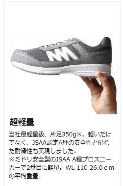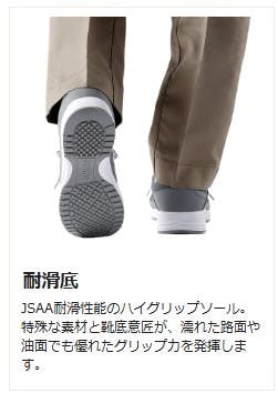 ●先芯:ワイド樹脂●甲被:人工皮革/メッシュ●中敷:EVA カップインソール(抗菌・防臭)●靴底:EVA/合成ゴム●標準重量:710g/足※両足での重さです※標準重量は、26.0cmを基準としています。●JSAA 認定 A種人工皮革製プロスニーカー/踵衝撃吸収/耐滑●優れた耐滑性能と衝撃吸収を持ちながら、驚くほど軽量化を実現したプロスニーカー。現場での負担を軽減し、快適な作業をサポートします。●原産国:中国