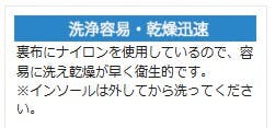●くっつき防止加工●裏布にナイロンを使用しているので、容易に洗え乾燥が早く衛生的です。※インソールは外してから洗ってください。