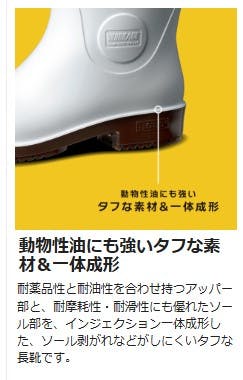 ●先芯:ワイド樹脂●甲被:PVC●中敷:EVAインソール(通気穴付)●靴底:PVC●標準重量:1,740g/足※両足での重さです※標準重量は、26.0cmを基準としています。●標準高さ:470mm(内、フード丈160mm)、標準筒周:435mm(ゴム部)※標準高さ、標準筒周は、26.0cmを基準としています。●JIS T8101 CII/S/F1/BO/UO●原産国:日本