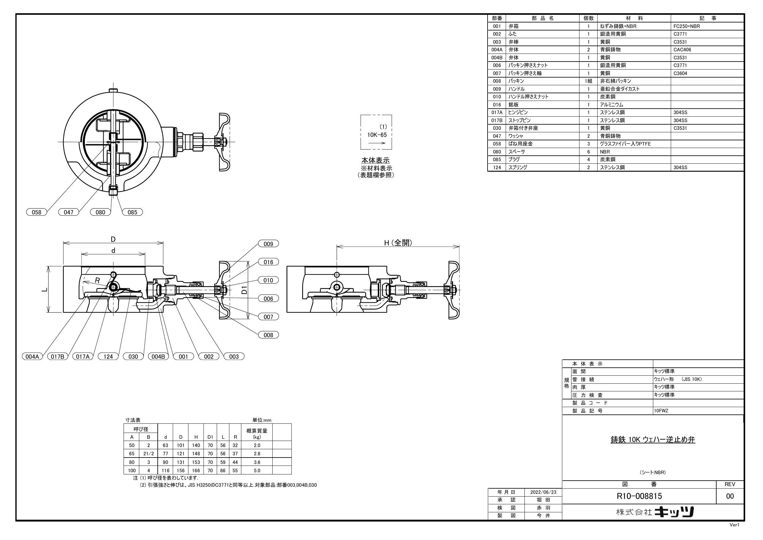 ●接続:ウエハ形 ●最高許容圧力:80℃以下の静流水:1.4MPa ●80℃以下の油●脈動水●空気:1.0MPa ●ボンネット/キャップ/カバー:C771BE:バイパスバルブ●ハンドル/レバー:ZDC2:バイパスバルブ●デュアルプレート式逆止弁 ●配管用ボルトナット付